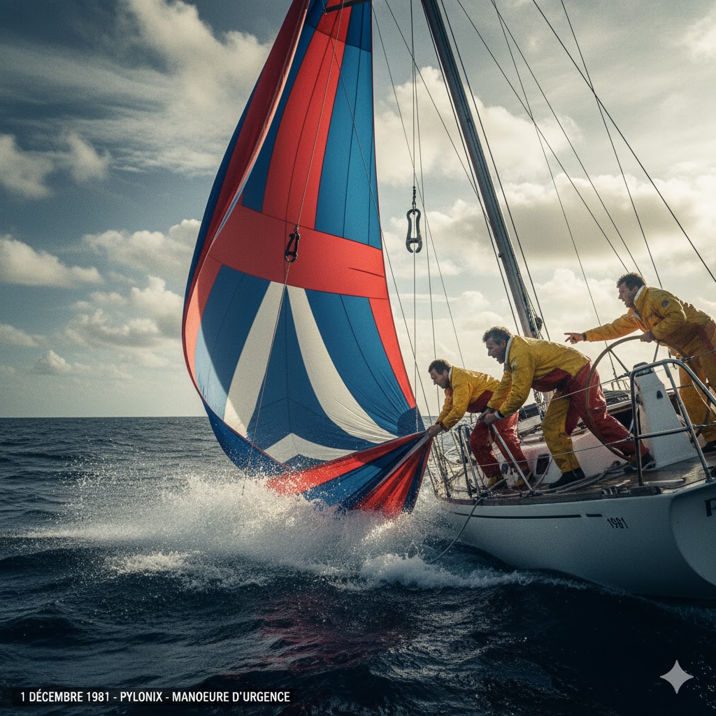 L’image était celle d’une catastrophe imminente : le spinnaker, gonflé par le vent et tiré par le mouvement du bateau, menaçait de passer sous la coque du « Pylônix », risquent de s’emmêler dans l’hélice ou le gouvernail, ce qui aurait pu avoir des conséquences désastreuses.